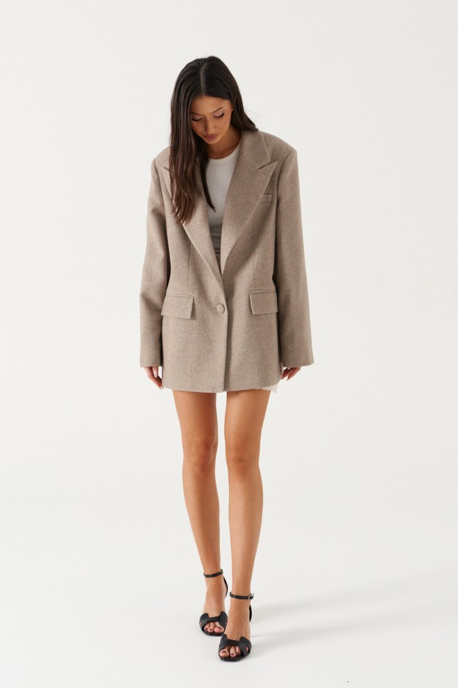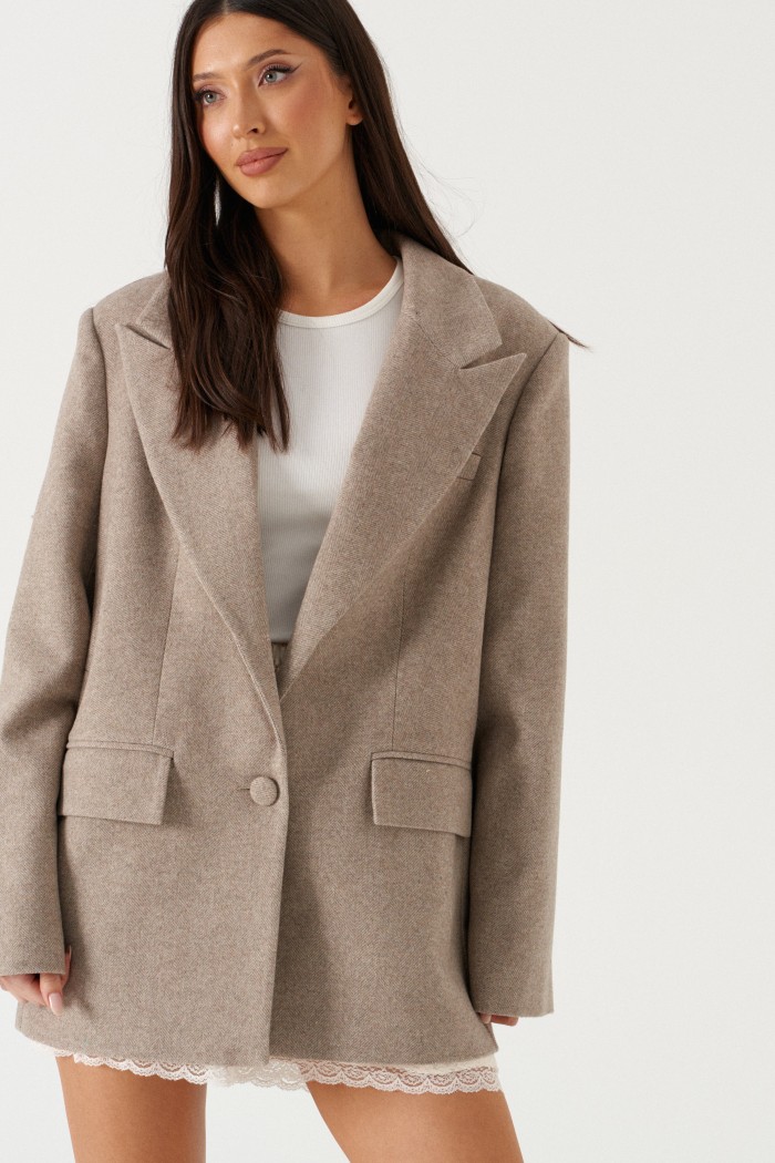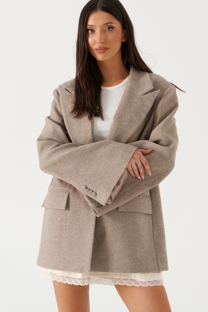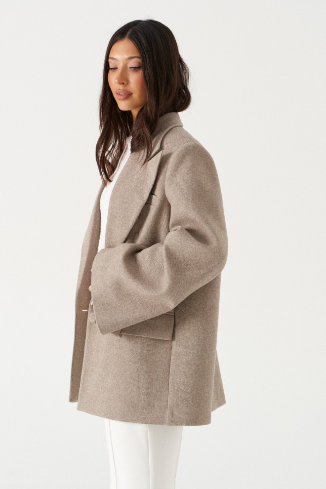 Жакет прямого свободного кроя, выполнен из ворсистой ткани. Характеристики: прямой свободный крой, брендированная подкладка, подплечники, воротник с остроугольным лацканом, застежка центральная на петлю - пуговицу, по переду функциональные карманы с клапаном, рукав к низу расклешен, втачной, чуть спущен, по низу рукава нашиты пуговички, спинка цельнокроеная. Длина по спинке 77, длина рукава от края горловины 84 см.
