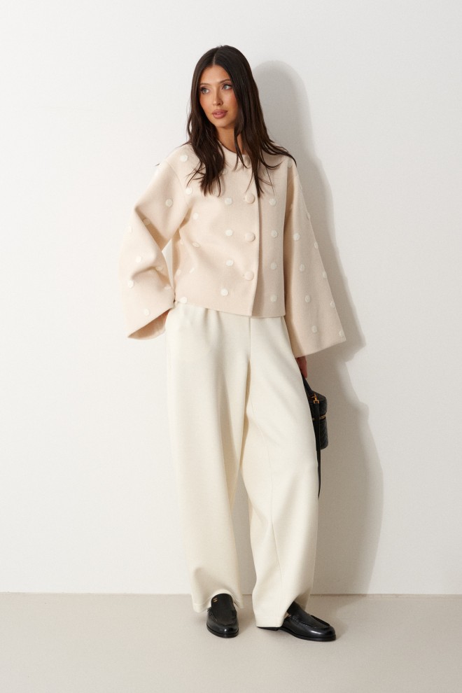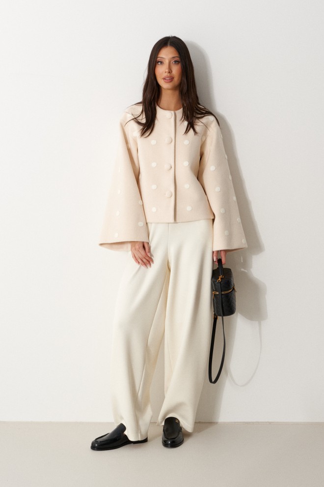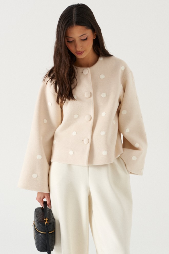 Жакет свободного прямого кроя, выполнен из мягкой ткани светло-бежевого цвета в белый горох. Характеристика: прямой крой, горловина круглая, застежка центральная на петли-пуговицы, рукав втачной спущенный, расширяется к манжету, брендированный подклад. Длина рукава от края горловины 71см. Длина по центру спинки 55 см