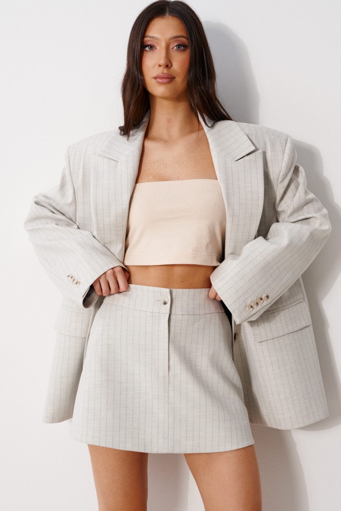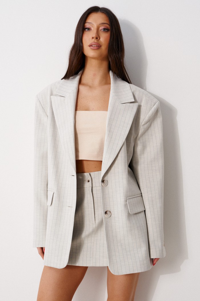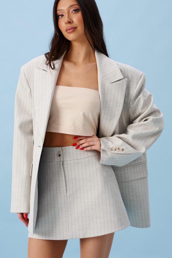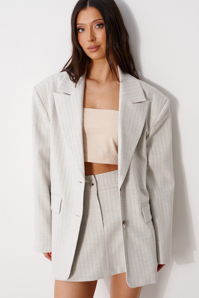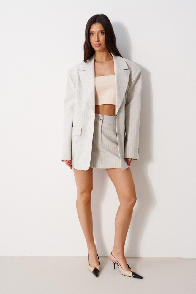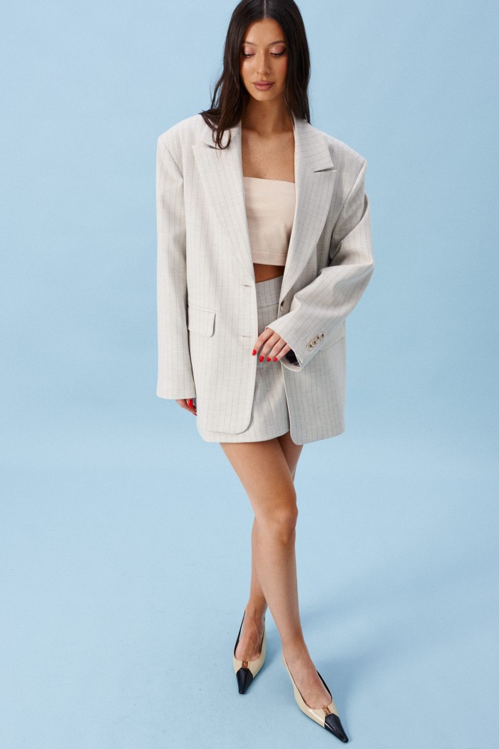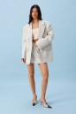 Жакет прямого кроя, выполнен из костюмной ткани светло-серого цвета в узку полоску. Характеристика: прямой свободный крой, воротник с остроугольным лацканом, застежка центральная на пуговицы, брендированный подклад, спереди прорези для функцинальных карманов с клапанами, плечо спушенное, рукав свободный, с декоративными пуговицами, в центральном шве по спинке разрез 25 см. Длина плеча 19 см, длина рукава от места втачивания 64см. Длина изделия по центральному шву по спинке 76 см.