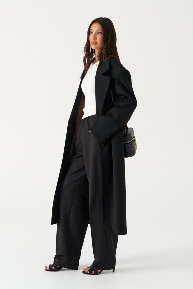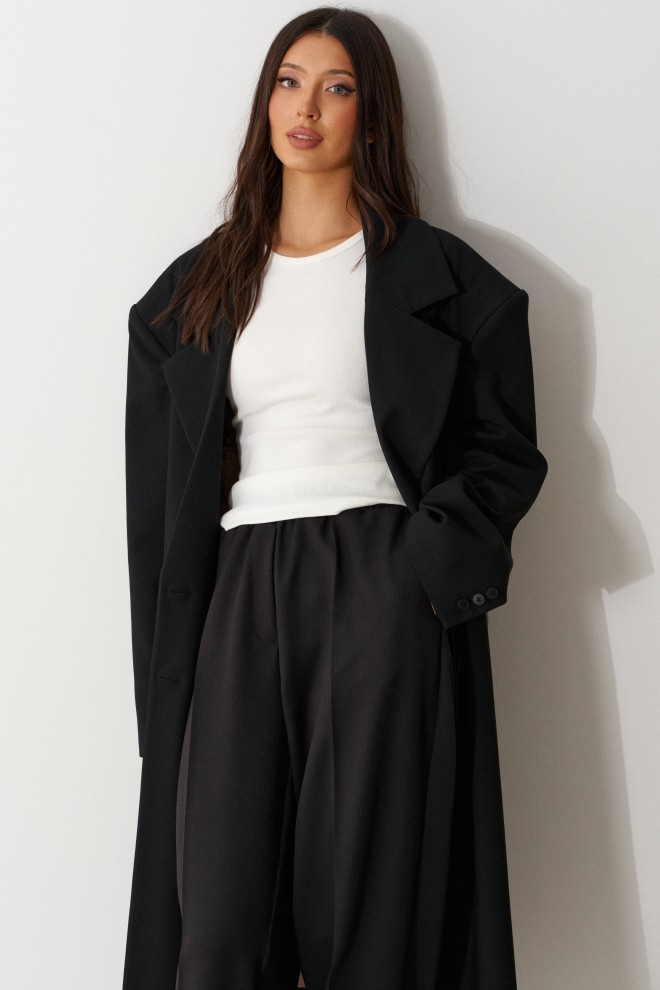 Жакет прямого свободного кроя, выполнен из костюмной ткани черного цвета. Характеристика: V-образный вырез горловины, отложной воротник, застежка центральная на две петли пуговицы, функциональные карманы с клапанами, брендированная подкладка, широкое плечо, подплечники, рукав втачной, на манжете функциональные пуговицы, в среднем шве заднего полотна изделия шлица 51 см. Длина изделия по центральному щву по спине 118 см, длина рукава от края горловины 84 см.