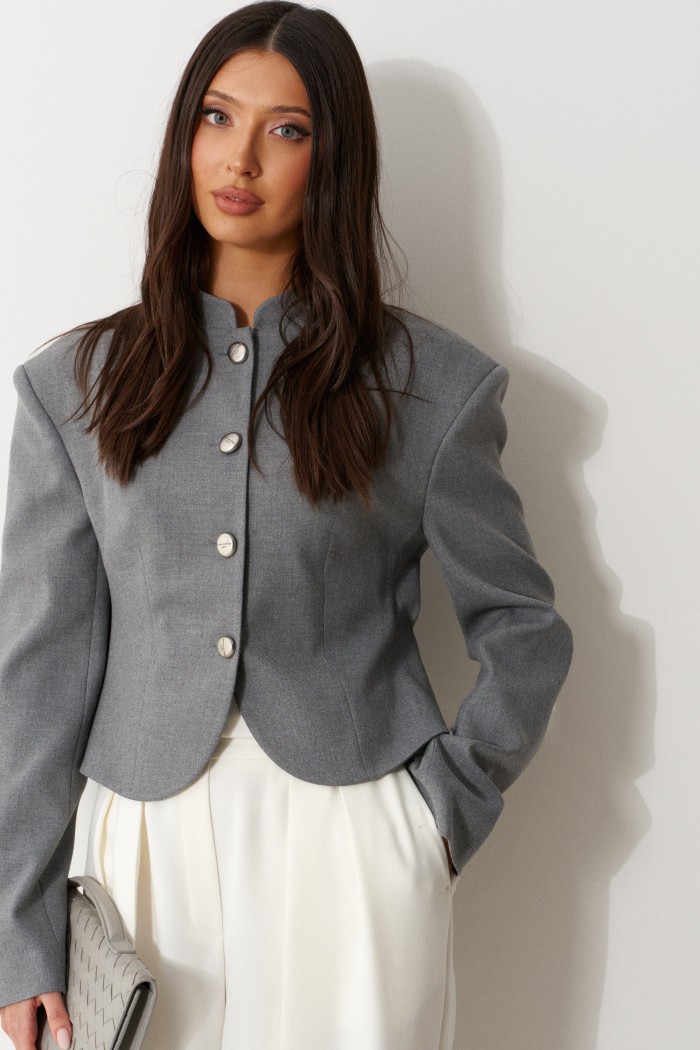 Жакет укороченный полуприталенного кроя. Выполнен из текстильного полотна серого цвета. Характеристики: горловина стойка, застежка центральнаяная на петли пуговицы, подплечники, рукав прямой, втачной. Внутри брдендированная подкладка. Длина рукава 64см, длина изделия 58см.