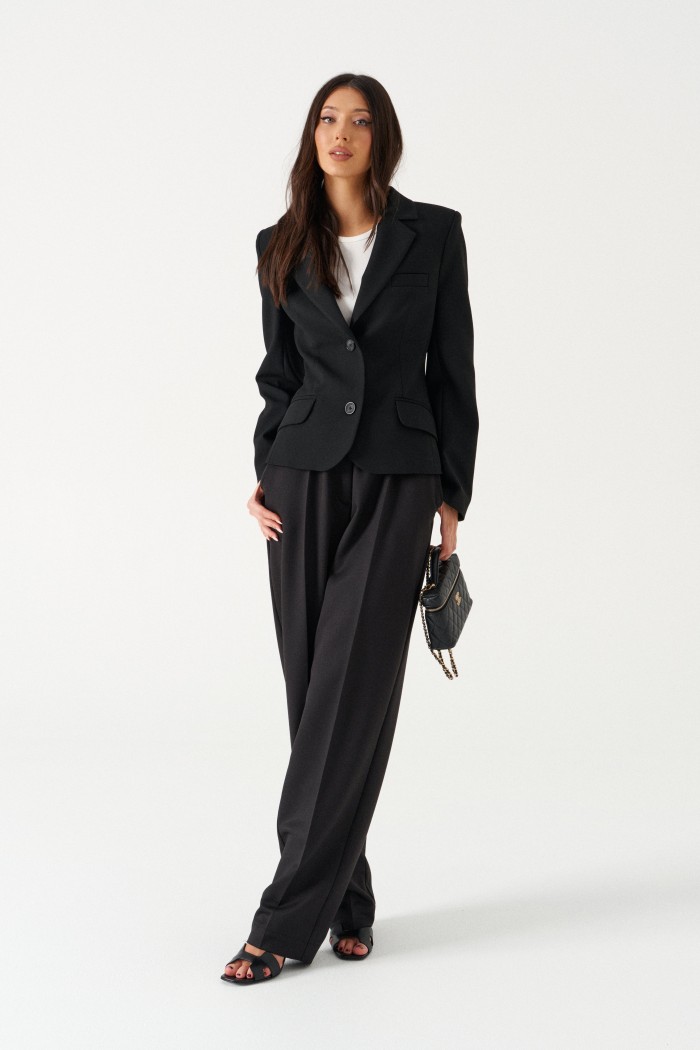 Жакет приталенного кроя выполнен из текстильного полотна черного цвета. Характеристики: приталеный крой, однобортный, брендированная подкладка, застежка центральная на петли и пуговицы, по переду накладные функциональные карманы, рукав втачной, три пуговицы на манжете. Длина рукава 64см, длина изделия 58см.