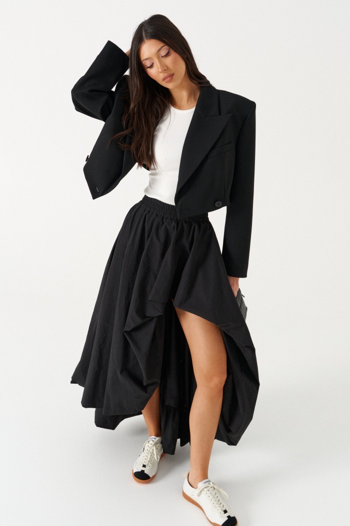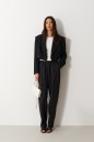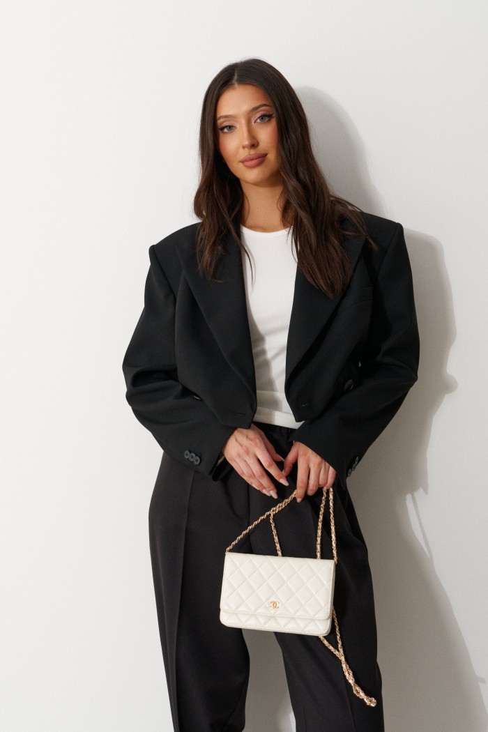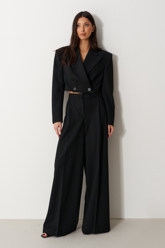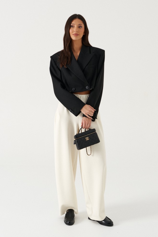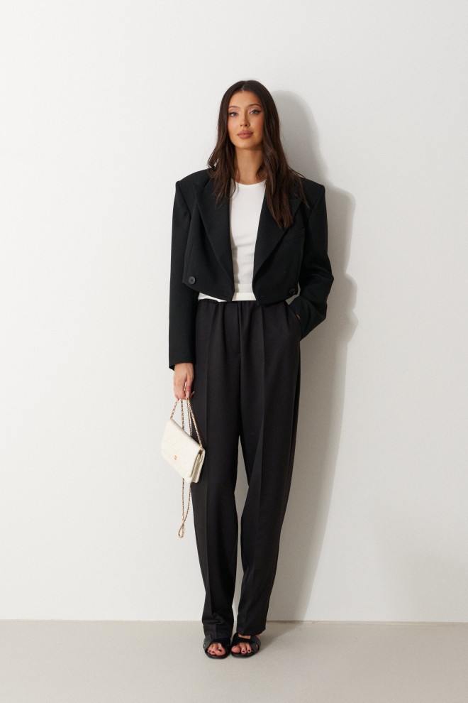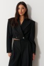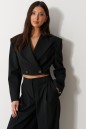 Жакет укороченный прямого кроя выполнен из текстильного полотна черного цвета. Характеристики: прямой крой, подкладка, воротник с остроугольным лацканом, подплечики, застежка на петли, пуговицы, втачной рукав, три пуговицы на манжете. Длина рукава 61см, длина изделия 39см.