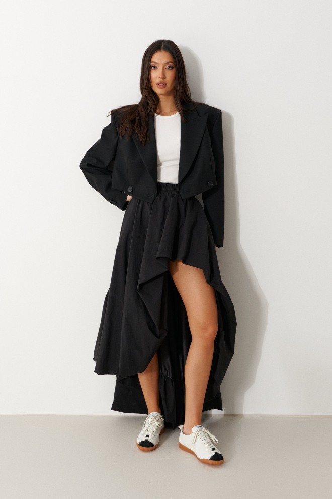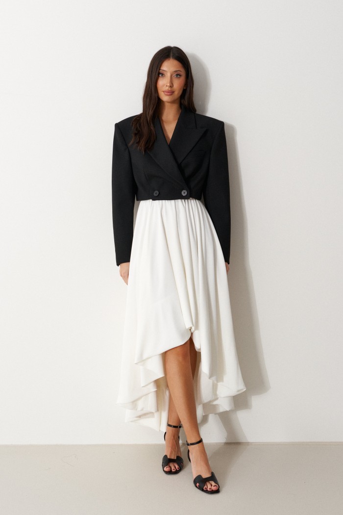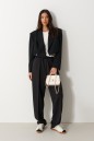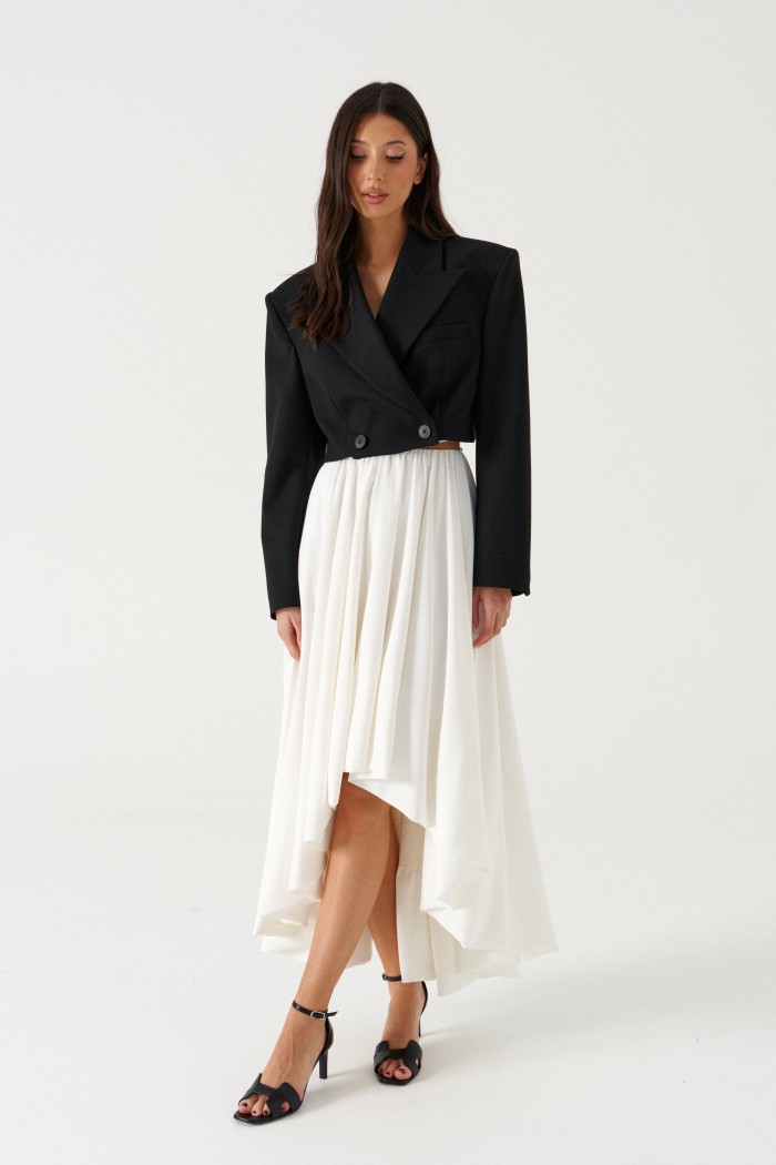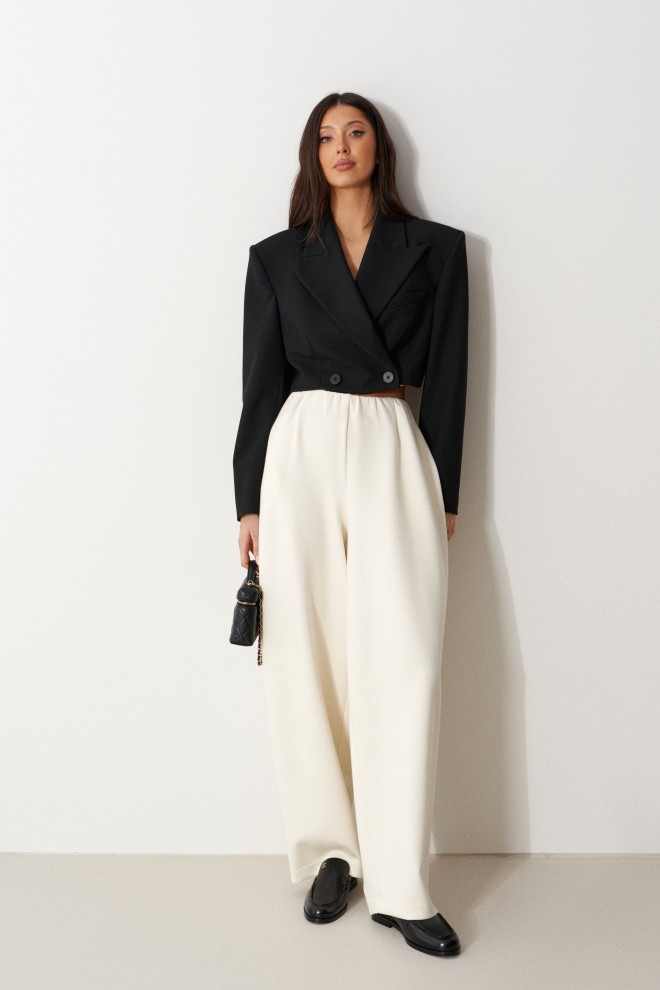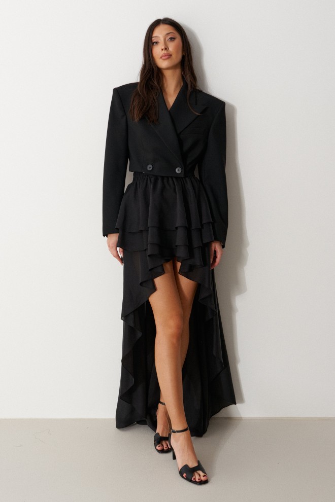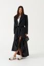 Жакет укороченный прямого кроя выполнен из текстильного полотна черного цвета. Характеристики: прямой крой, подкладка, воротник с остроугольным лацканом, подплечики, застежка на петли, пуговицы, втачной рукав, три пуговицы на манжете. Длина рукава 61см, длина изделия 39см.