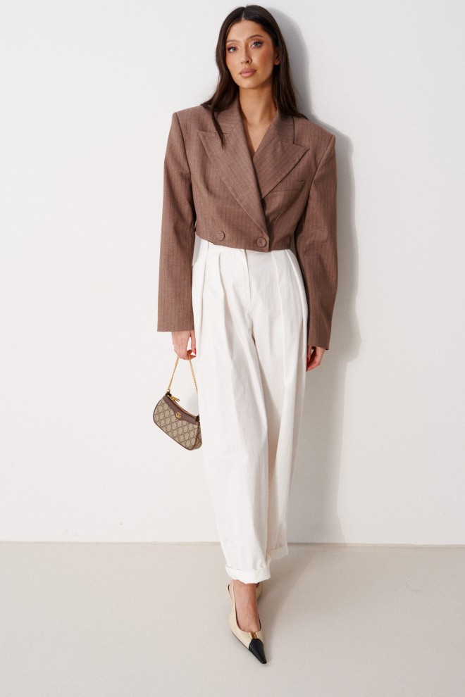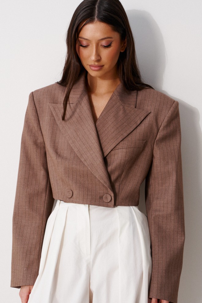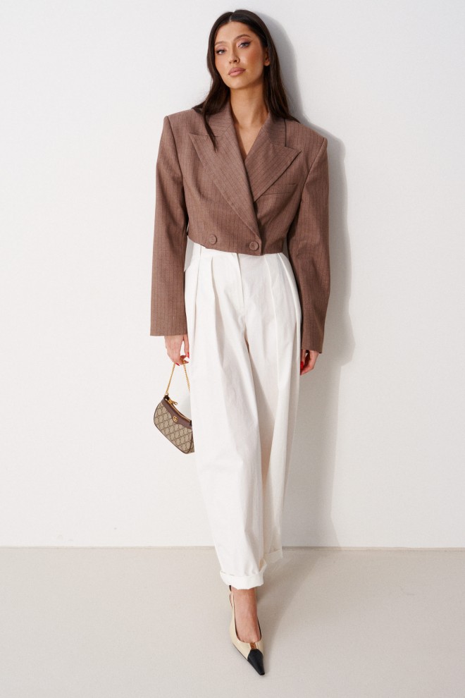 Жакет укороченный прямого кроя, выполнен из костюмной ткани коричневого цвета в черную полоску. Характеристики: прямой крой, подкладка, воротник с остроугольным лацканом, подплечики, застежка на петли-пуговицы, втачной рукав, три пуговицы на манжете. Длина рукава от линии втачивания 63 см, длина изделия 39см.