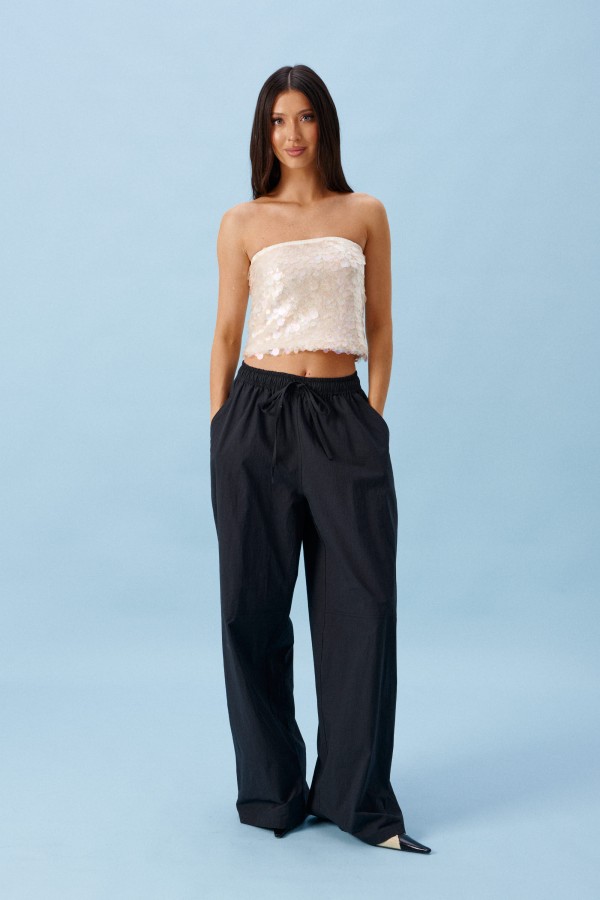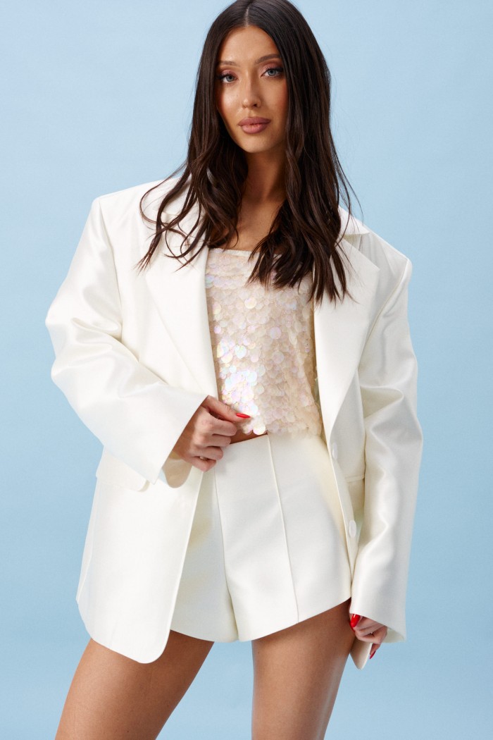 Жакет прямого кроя, выполнен из плотной костюмной ткани светлого цвета с блеском. Характеристика: прямой свободный крой, воротник с остроугольным лацканом, застежка центральная на пуговицы, подклад, спереди прорези для функцинальных карманов с клапанами, плечо спущенное, подплечники, рукав свободный, на внешнем шве рукава внизу имитация разреза, в центральном шве по спинке шлица 24 см. Длина плеча 19 см, длина рукава от места втачивания 63см. Длина изделия по центральному шву по спинке 76 см.