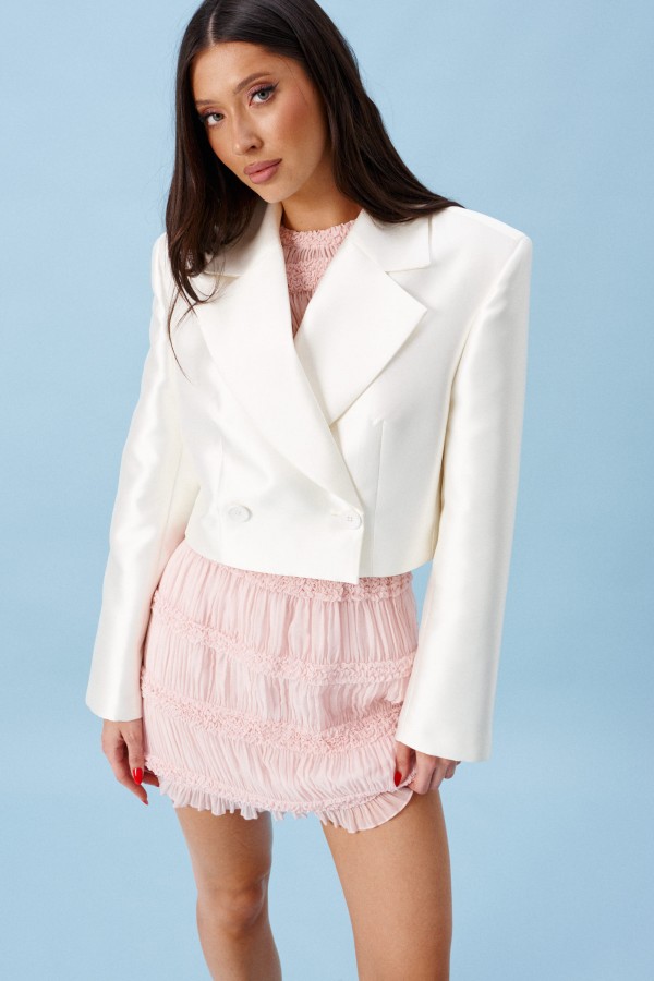 Жакет укороченный прямого кроя выполнен из плотной костюмной ткани белого цвета с блеском. Характеристики: прямой крой, подкладка, воротник с остроугольным лацканом, подплечики, застежка на петли, пуговицы, втачной рукав, манжета с разрезом, без пуговиц. Длина рукава 63см, длина изделия 44см.