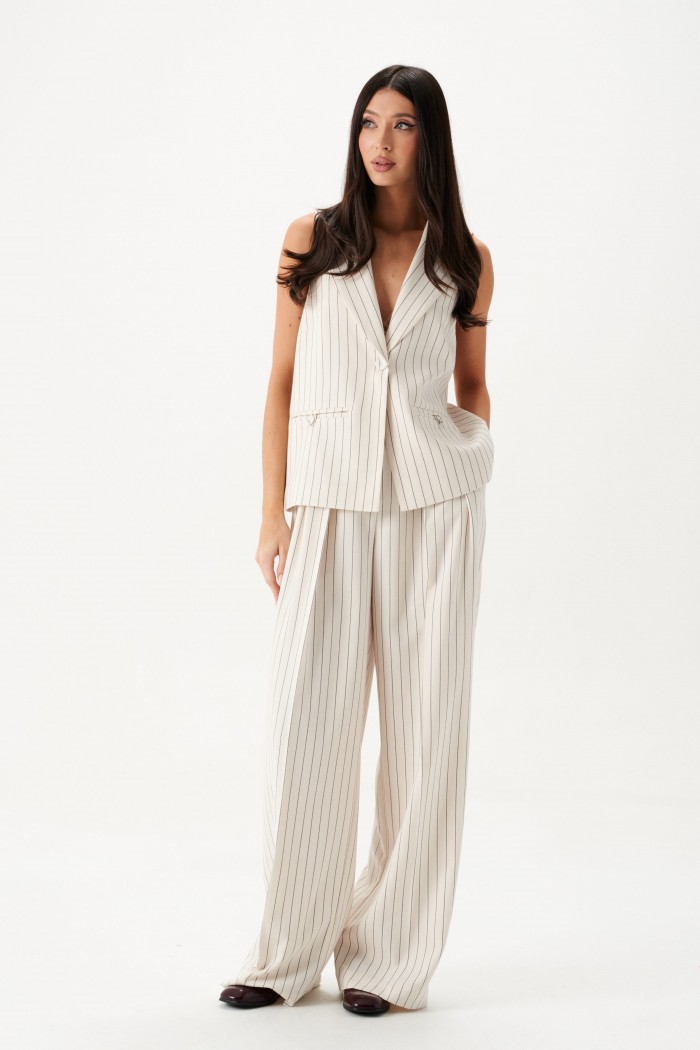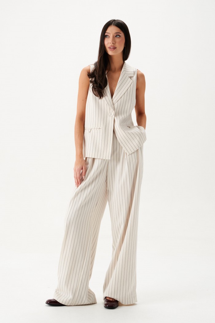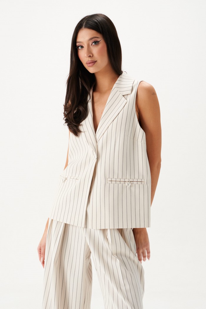 Жилет однобортный. Выполнен из костюмной ткани. Прямой крой, подклад, воротник отложной с широким лацканом. Карманы прорезные (функциональные). Длина по спинке 60 см.