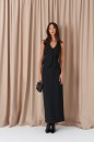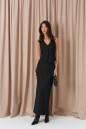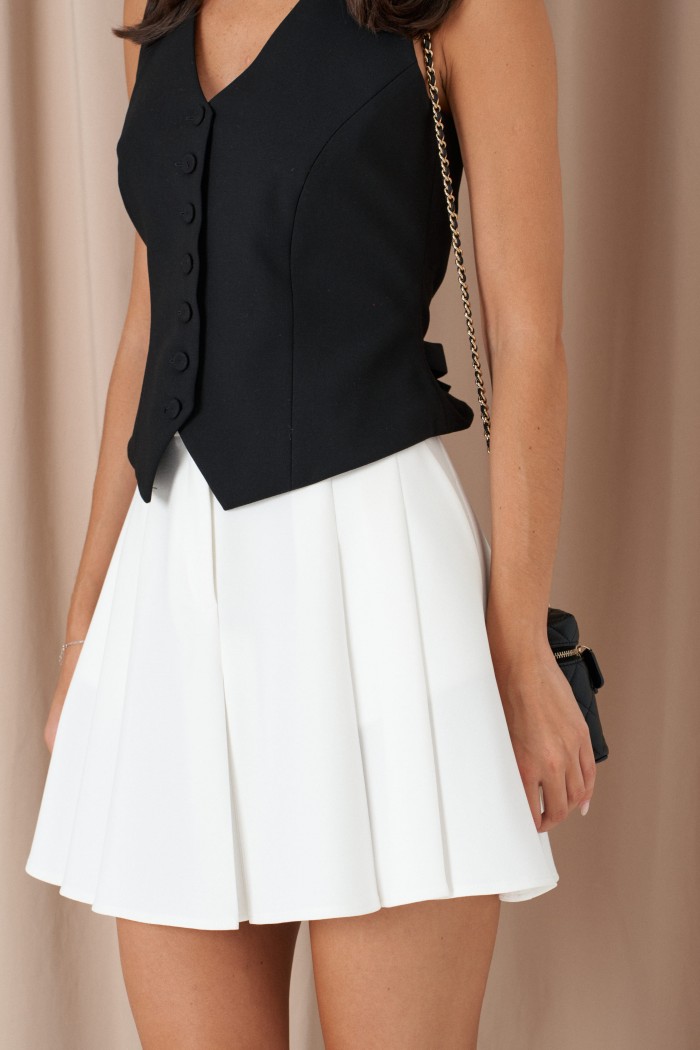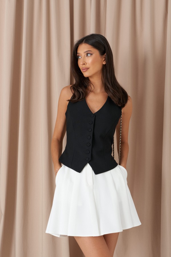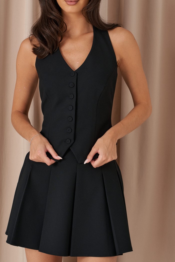 Жилет прилегающего силуэта. Выполнен из костюмной ткани чёрного цвета. С подкладкой. Вырез декольте V-образный. Спинка открытая, с хлястиком и пуговичкой. Застёжка центральная пуговицы. Длина по боковому шву от линии глубины проймы 26 см
