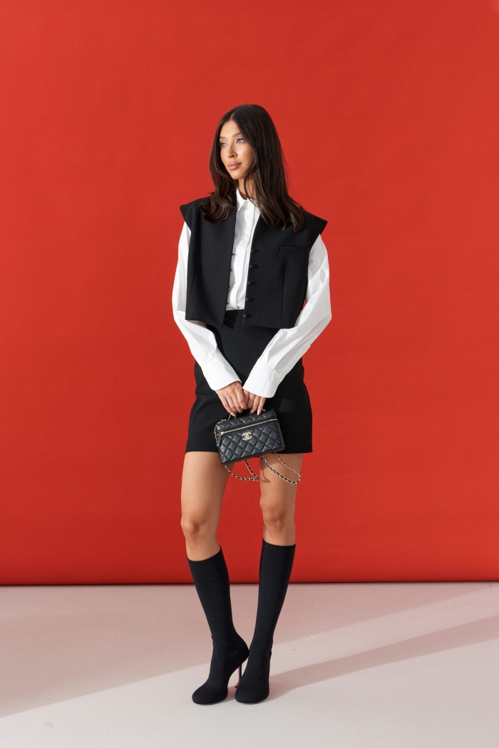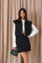 Жилет прямого свободного кроя выполнен из текстильного полотна черного цвета. Характеристики: прямой свободный крой,брендированная подкладка, застежки центральные на петли - пуговицы, декоративный карман. Длина по спинке 41см.