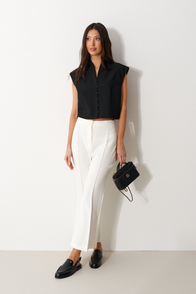 Жилет прямого свободного кроя выполнен из текстильного полотна черного цвета. Характеристики: прямой свободный крой,брендированная подкладка, застежки центральные на петли - пуговицы, декоративный карман. Длина по спинке 41см.