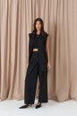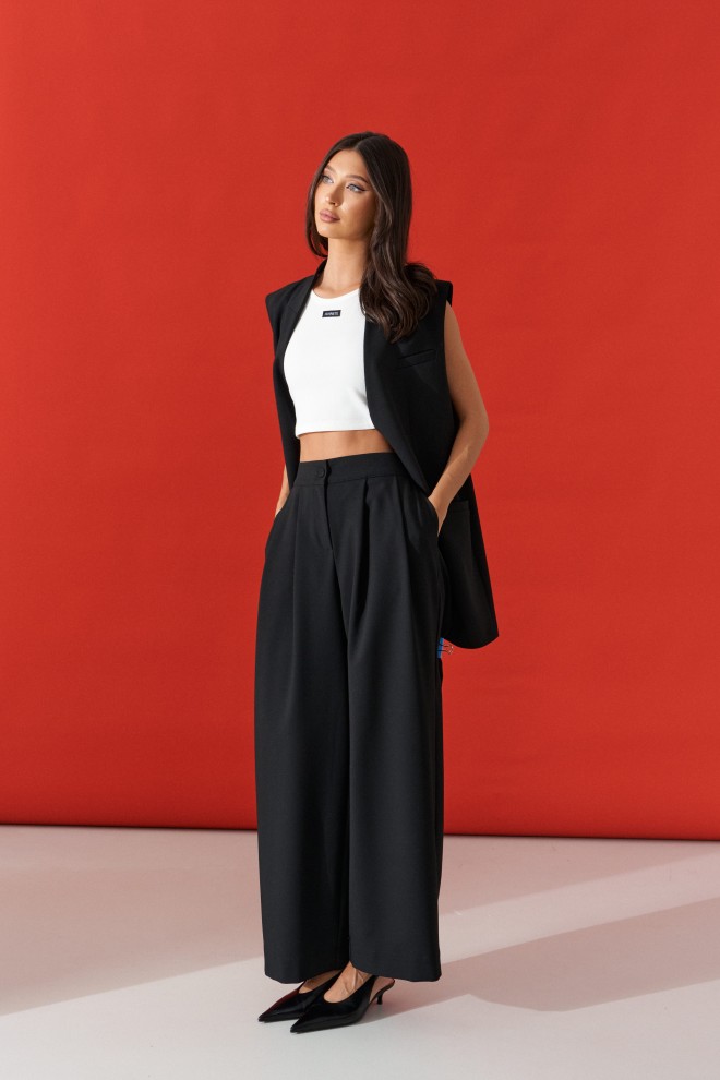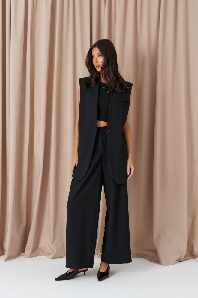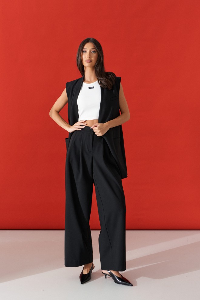 Жилет прямого кроя, выполнен из костюмной ткани черного цвета. Характеристики: прямой крой, воротник-стойка, брендированная подкладка, застежка центральная на пуговицу, бока втачные, по переду прорези с карманами, на груди имитация кармана. Длина по спинки 77 см.