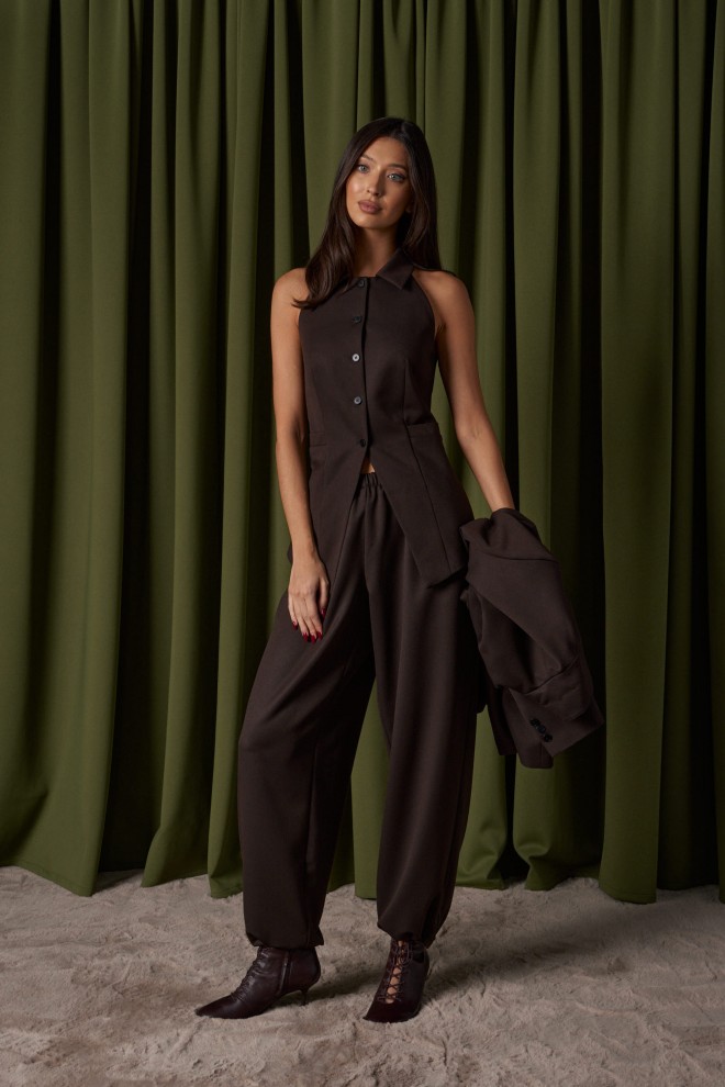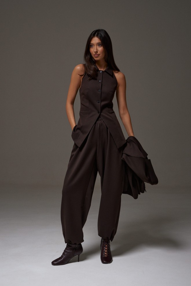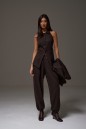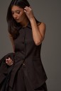Жилет с открытыми плечами прилегающего силуэта выполнен из костюмной ткани шоколадного цвета. Характеристики: прилегающий силуэт, подкладка, застежка центральная на петли пуговички, отложной воротник, по переду изделия карманы. Длина по спинке 59 см.