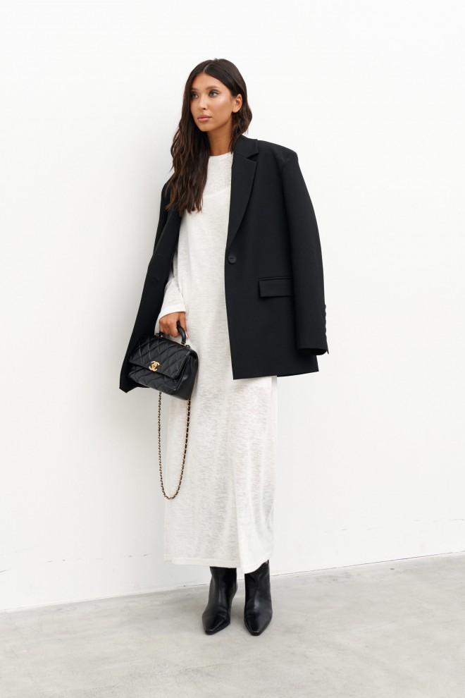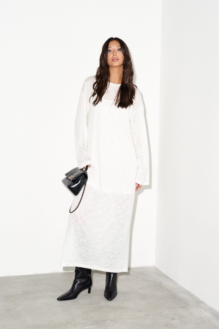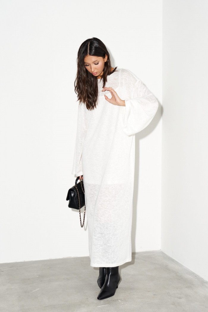Комплект состоит из двух платьев: платье на бретелях и платье прямого свободного кроя. Выполнен из полупрозрачного трикотажного полотна белого цвета. Характеристики:нижнее платье полуприлегающего силуэта, А-образный силуэт, бретели - не регулируемые. Длина по спинке 65 см. Верхнее платье прямого свободного кроя, горловина овальная, рукав спущен. Длина по спинке от края горловины 131 см, длина рукава от края горловины 75 см.