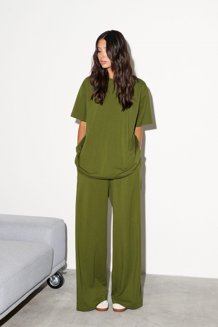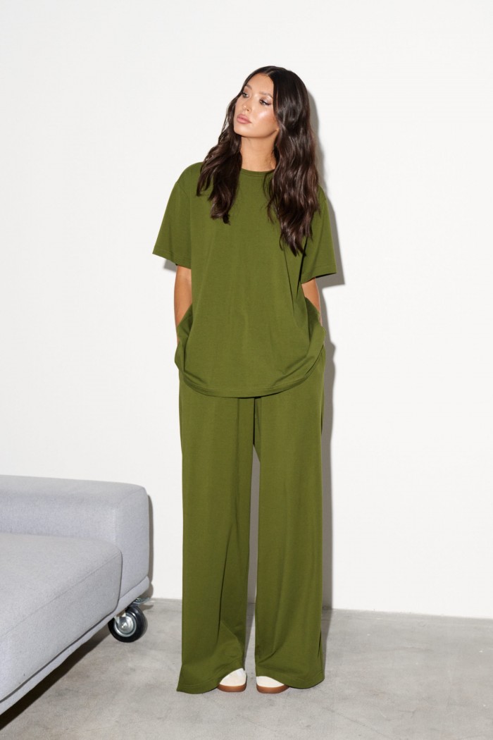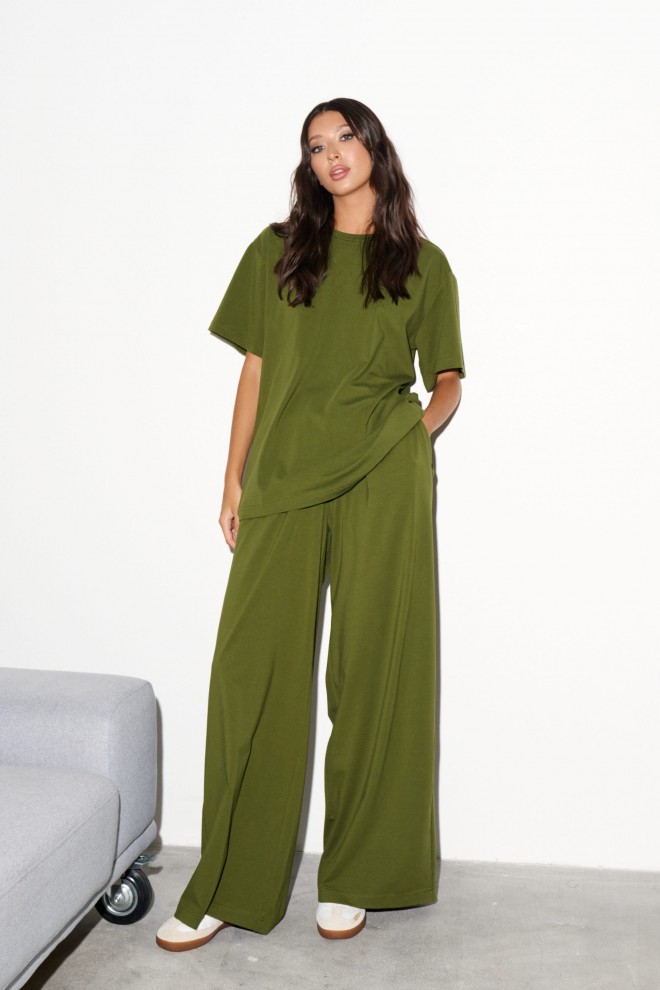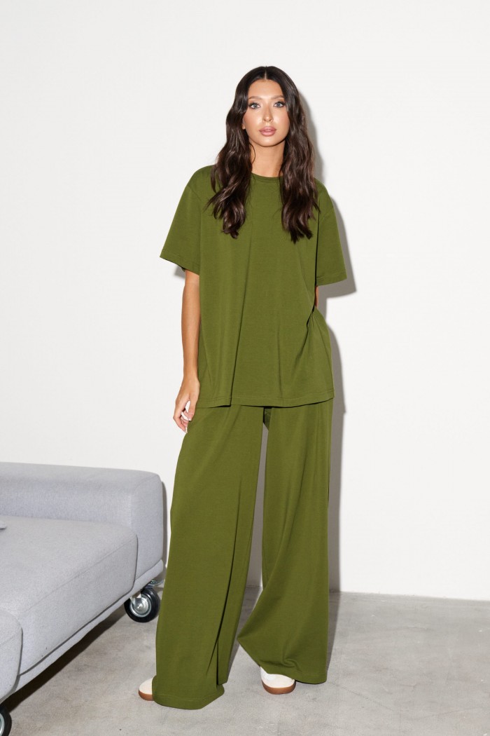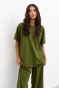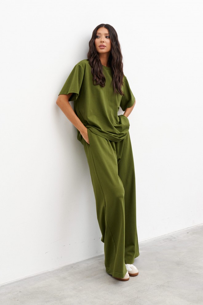 Комплект 2-х предметный, состоит из футболки и брюк выполнен из хлопкового полотна цвета хаки. Характеристики: футболка прямого свободного кроя, овальный вырез горловины, рукав втачной спущенный . Длина по спинке от края горловины 70 см, длина рукава от края горловины 37 см. Брюки прямого свободного кроя, пояс на резинке, в боковых швах карманы. Длина брюк по боковому шву 112 см.