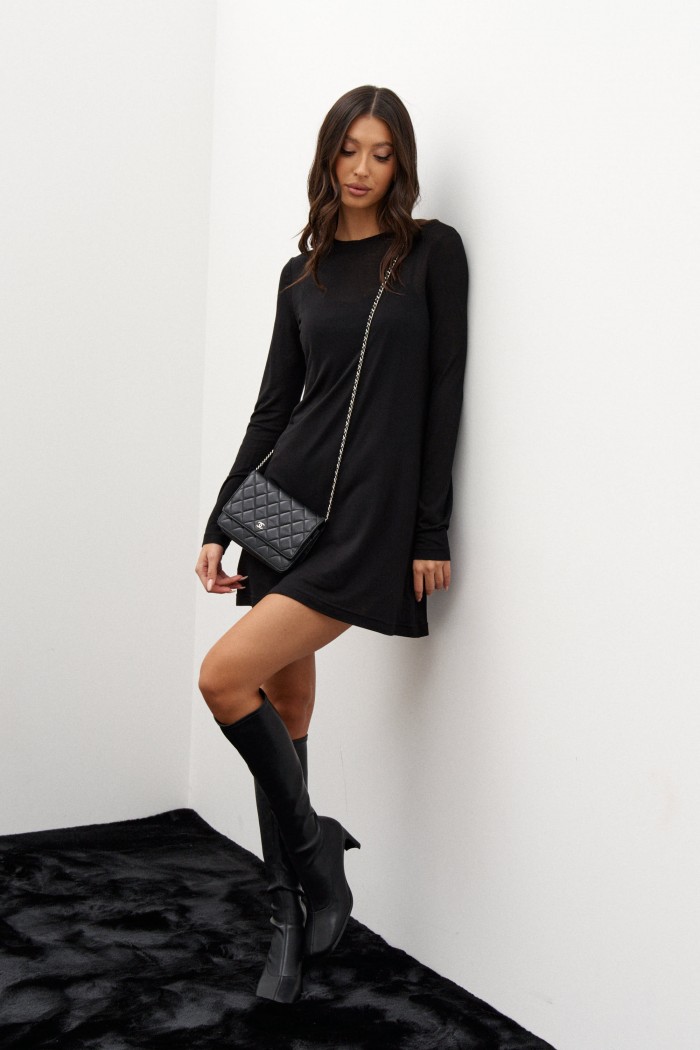 Комплект состоит из двух платьев: платье на бретелях и платье полуприлегающего силуэта. Выполнен из полупрозрачной трикотажной ткани черного цвета. Характеристики:нижнее платье полуприлегающего силуэта, А-образный силуэт, бретели - не регулируемые. Длина по спинке 61 см. Верхнее платье полуприлегающего силуэта, силуэт трапеция, горловина овальная, рукав втачной. Длина по спинке 81 см, длина рукава 66 см.