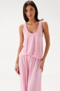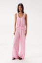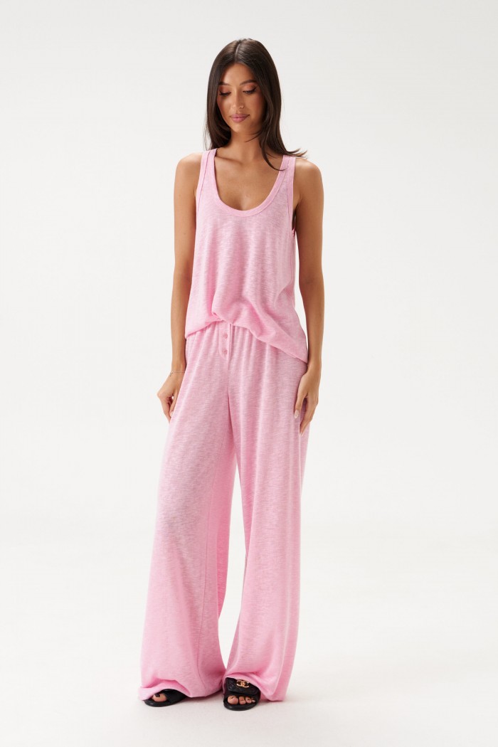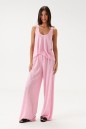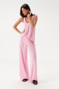 Комплект состоит из туники и брюк выполнен из полупрозрачного трикотажного полотна розового цвета. Характеристики: туника прямого кроя, без рукава, горловина овальная в боковых швах разрезы. Длина по спинке 64 см. Брюки прямого кроя, пояс брюк на резинке, иммитация застежки на пуговички по переду. Длина 106 см.