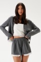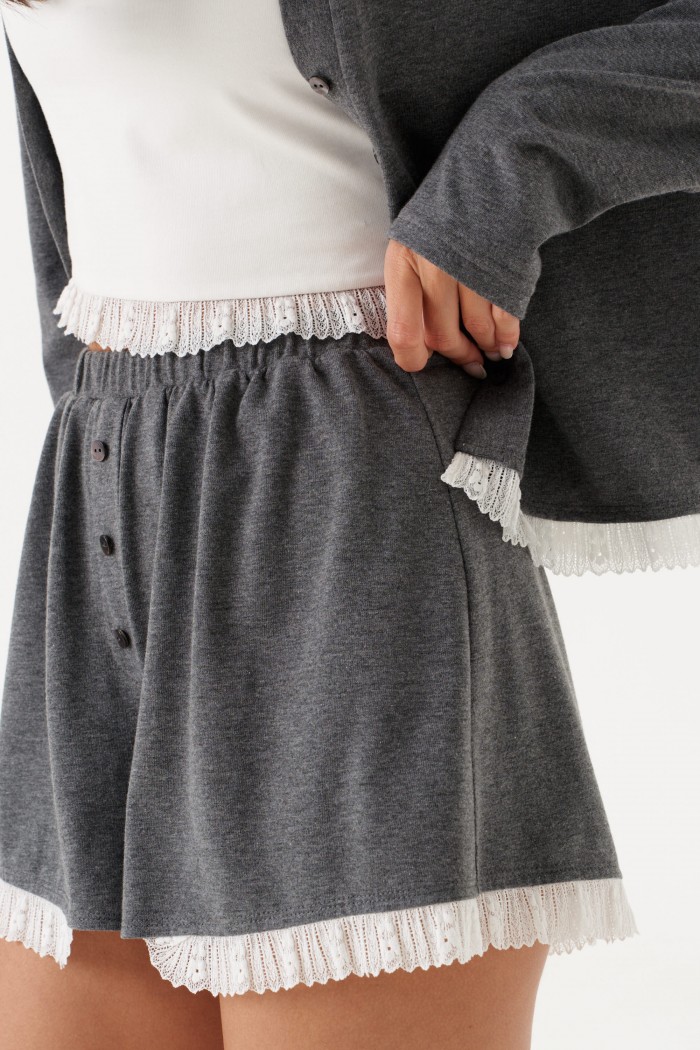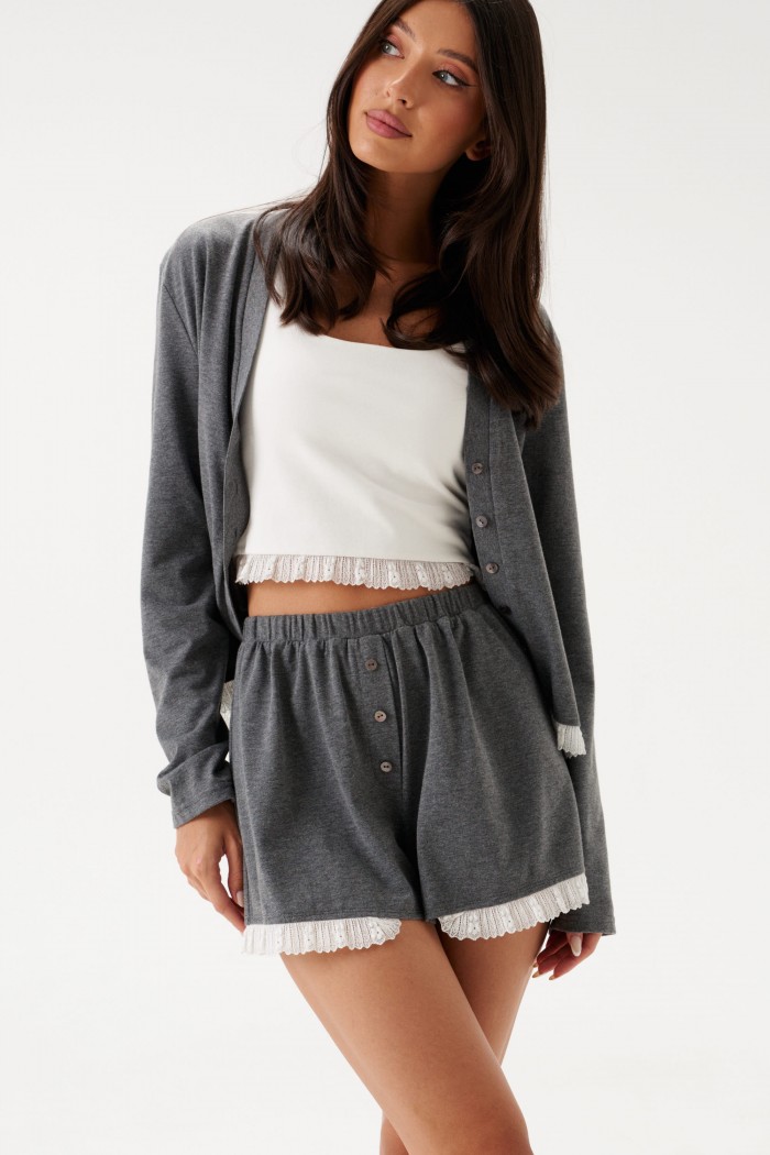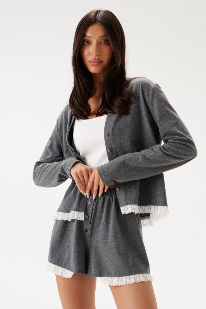 Комплект с шортами выполднен из трикотажного полотна серого цвета. Джемпер прямого широкого кроя, V-образный срез горловины, застежка центральная на петли пуговички, рукав втачной слегка спущен, по низу нашито декоративное кружево. Длина изделия по спинке 56 см, длина рукава от горловины 75 см. Шорты свободного кроя. Пояс на резинке. По передней части имитация застежки на 3 пуговицы. По низу нашито декоративное кружево. Длина 36 см.